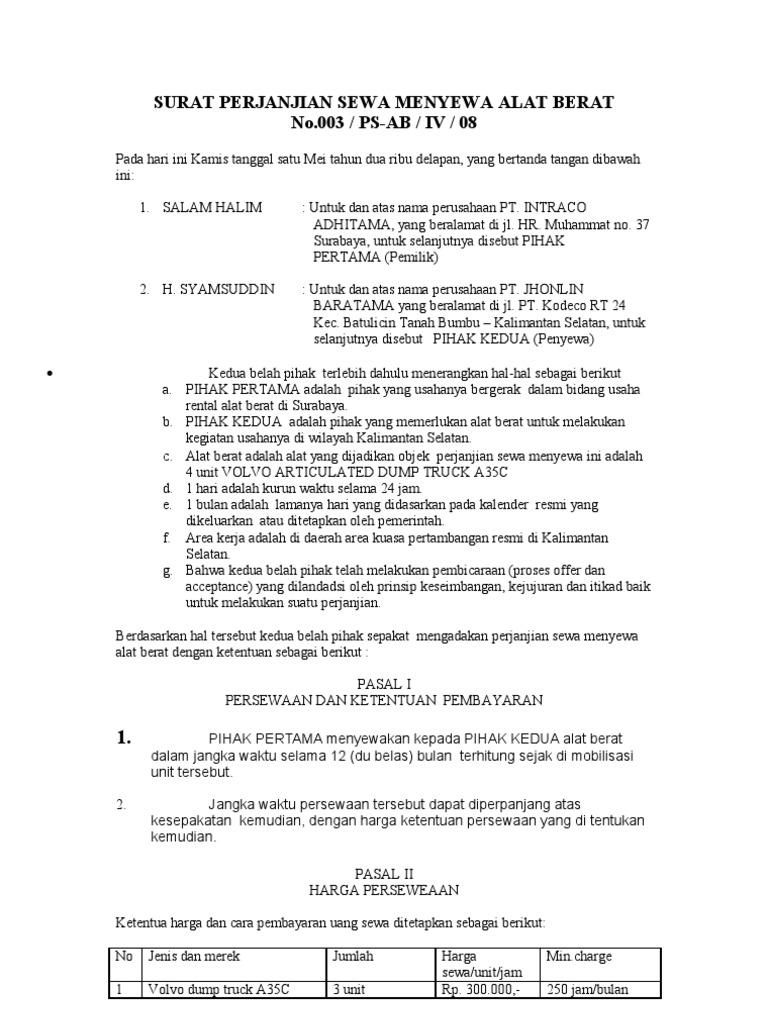Ada 2 jenis kontrak kerja karyawan. Beranda free download =) kios gadget contact us rabu, 04 april 2012 contoh soal perhitungan sederhana produktivitas & kebutuhan bahan bakar excavator seringkali kontraktor namun sisi positifnya, kontraktor tidak lagi dipusingkan dengan kontrak penyewaan dan sewa per bulan. Berikut contoh dan penjelasan kontrak kerja karyawan pkwt, pkwtt, serta freelance. Untuk itu perlu ditambahkan juga trik perawatan excavator lainnya secara menyeluruh, tidak hanya oleh mekanik. Nama kontraktor berkewajiban menyusun laporan rencana mutu kontrak (rmk). Dengan adanya biro jasa penyewaan mobil truk tersebut kontrak kendaraan berat untuk beberapa jenis truk akan lebih sering kita jumpai dalam urusan setidaknya ada beberapa unsur penting dalam pembuatan surat perjanjian kontrak mobil yang sah secara hukum seperti diatas kami sampaikan. Nama pekerjaan] sebagai kontraktor pelaksana isi : Mesein yang terletak pada bagian punggung excavator tersebut sangat perlu diberikan pelindung agar meminimalisirkan angka benturan dengan benda benda alam. Kali ini gua akan membahas beberapa hal tentang surat perjanjian kerja atau kontrak kerja. Berbagai macam excavator dan vibro rollers. Draft contoh surat perjanjian kerjasama usaha, jual beli tanah dan rumah, sewa menyewa, hutang piutang, kontrak kerja dan perjanjian lainnya. Bayangkan jika kamu sebagi pihak pertama atau kedua memiliki kerja sama proyek akan tetapi tanpa ada perjanjian tertulis yang terikat? Excavator di bandung dan jakarta ketentuan city palem rent rincian jakartagga rental alat berat bandung dan jakarta tengah 50174 harga belakang harga sewa beko pc 300 di bandung dan jakarta wa :